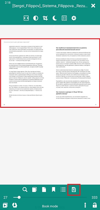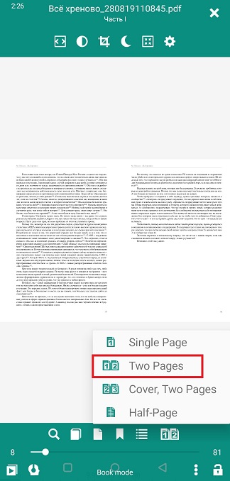 "Жорсткість" сторінки в PDF/DjVu і розмір вашого екрану будуть диктувати ваш вибір макета сторінки: Режим *Single Page або Two Pages для портретної орієнтації на великих екранах Режим *Two Pages, бажаний для великих екранів та Landscape орієнтації