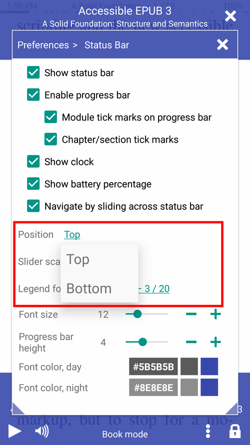 - Opção para alterar a posição da barra de status (Superior ou Inferior) no modo Livro