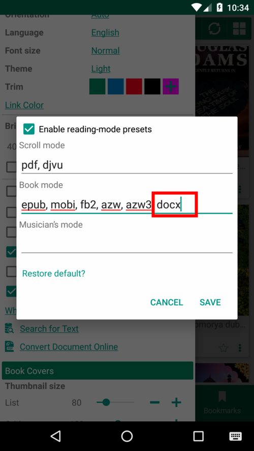 - Indica a Librera quale modalità di lettura predefinita preferisci per un particolare formato di libro