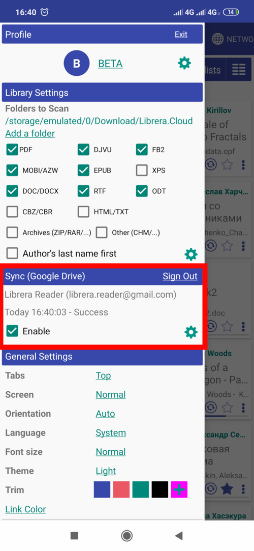 La sincronizzazione deve essere utilizzata su più dispositivi Android collegati a Google Drive. Durante la lettura di un libro, potrai riprenderti sul tablet durante la notte proprio nel punto in cui eri rimasto sul telefono durante il giorno. La sincronizzazione è supportata da tutte le app della famiglia Librera. Ed è GRATUITO.