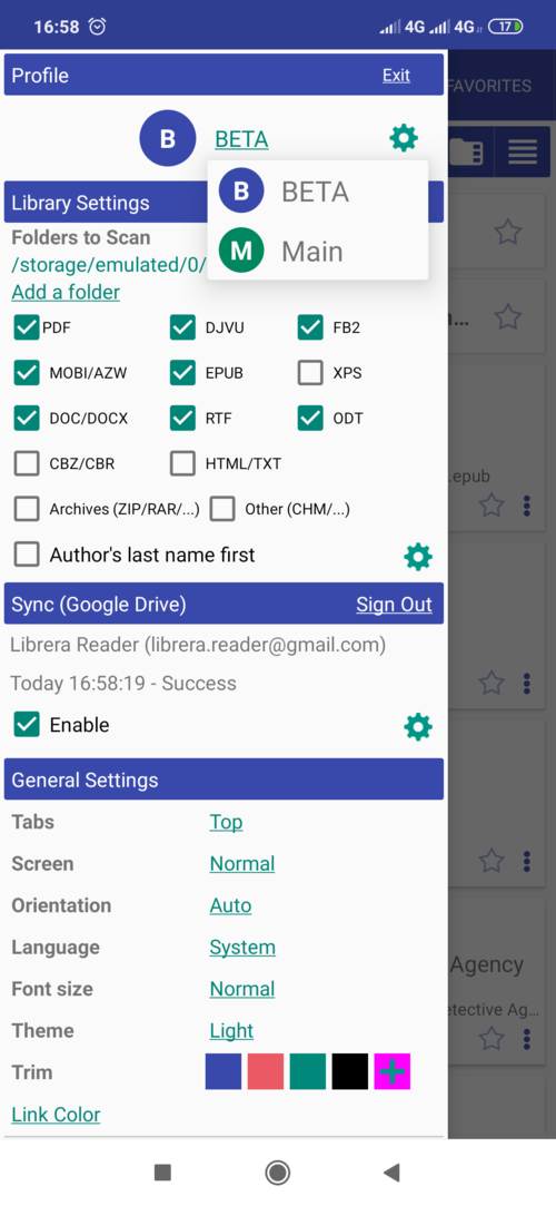 I profili sono memorizzati nella memoria interna del dispositivo in /sdcard/Librera/profile.[NAME]. Le loro impostazioni, i segnalibri, i progressi di lettura sono memorizzati in file JSON, che possono essere visualizzati con qualsiasi visualizzatore JSON (astenersi dal modificarli, però!).