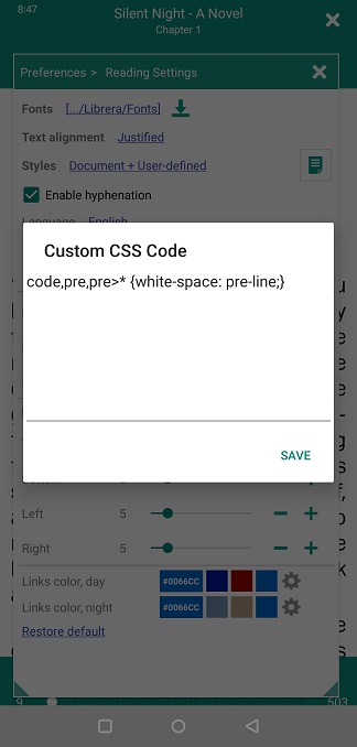 Librera使您可以自定义正在阅读的文档的外观和感觉-根据喜好选择字体并调整其大小调整CSS样式以及将首字母更改为首字母缩写(FB2)。