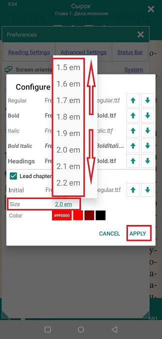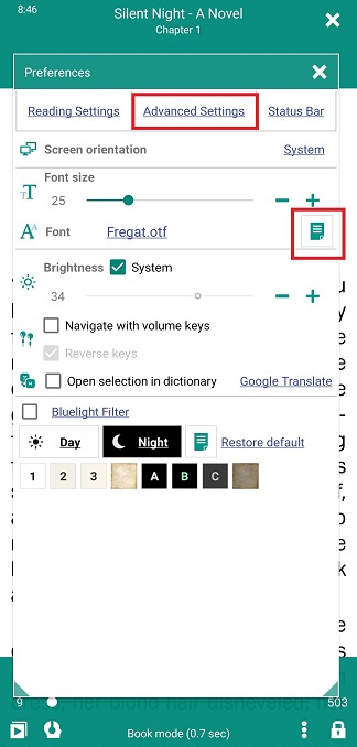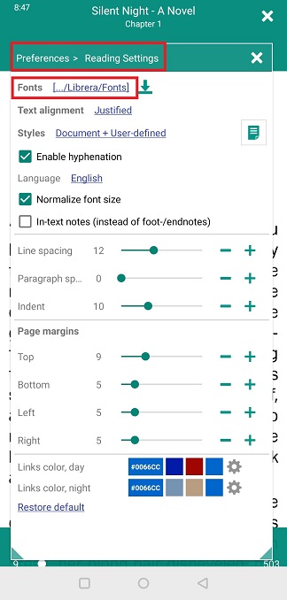您可以将喜欢的字体添加到列表中: 1.在设备的内部存储中创建一个名为_Fonts_的文件夹。 注意内部存储器中还有一个_Fonts_文件夹该文件夹已经由Librera自动创建。 2.将喜爱的字体保存到_Fonts_文件夹(或Librera自己的_Fonts_文件夹)。 (您也可以从我们的网站下载一些不错的字体。有关说明,请参见阅读设置一节。) 请记住,只有在阅读设置选项卡中选择的_Styles_中包含_User-defined_时才会尊重您的字体。