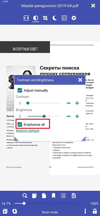 Читабельність PDF у Librera Reader можна значно покращити за допомогою ручного налаштування яскравості та контрастності. Коли ви перейдете в ручний режим, ваш документ буде відображатися у чорно-білому кольорі, і ви побачите результати своїх змін у режимі реального часу у фоновому режимі за вікном Контрастність та яскравість. Коригування імітують ефект, який часто використовується в зчитувачах E-Ink.