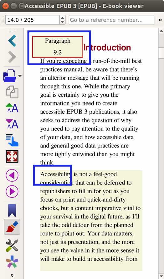 Gemäß einem Online-Handbuch von Calibre Viewer wird im Referenzmodus am Anfang jedes Absatzes eine eindeutige Nummer angezeigt, die sich auf diesen bestimmten Absatz bezieht. "Diese Zahl ist unabhängig von der Größe des Viewer-Fensters oder der Schriftgröße." Die Nummern können zum Zuordnen des Dokuments, zum Erstellen eines Inhaltsverzeichnisses, zum Speichern von Lesezeichen usw. verwendet werden.