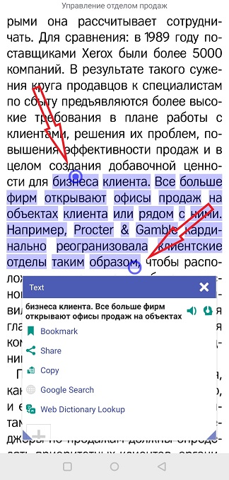 Librera的文本选择选项非常复杂。长按(并拖动),您可以选择单词,段落和整页。然后,您可以轻松地通过单击复制文本以将其粘贴到另一个应用程序中,与其他用户共享您的选择,制作书签,将其发送到TTS引擎(以大声朗读)或打开/关闭线路翻译/词典等