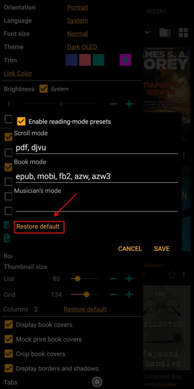 Você também pode especificar modos de leitura padrão para cada formato de e-book.