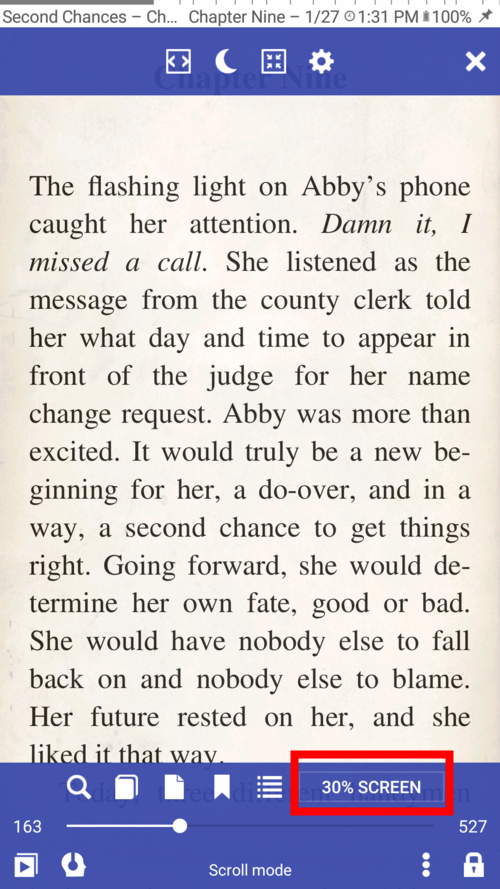 No modo de rolagem, as páginas dos livros são roladas para cima e para baixo com os dedos